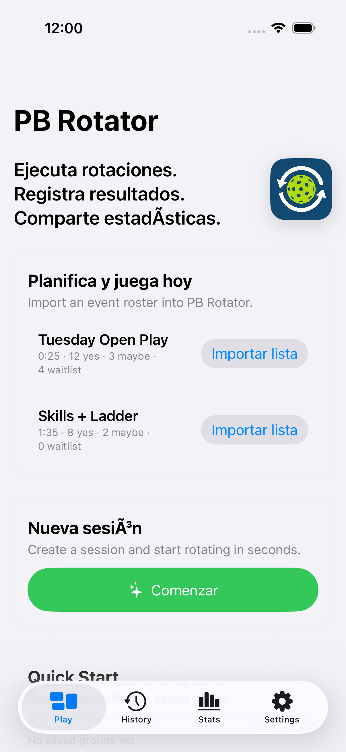 Rotaciones de pickleball rápidas y justas — en segundos.