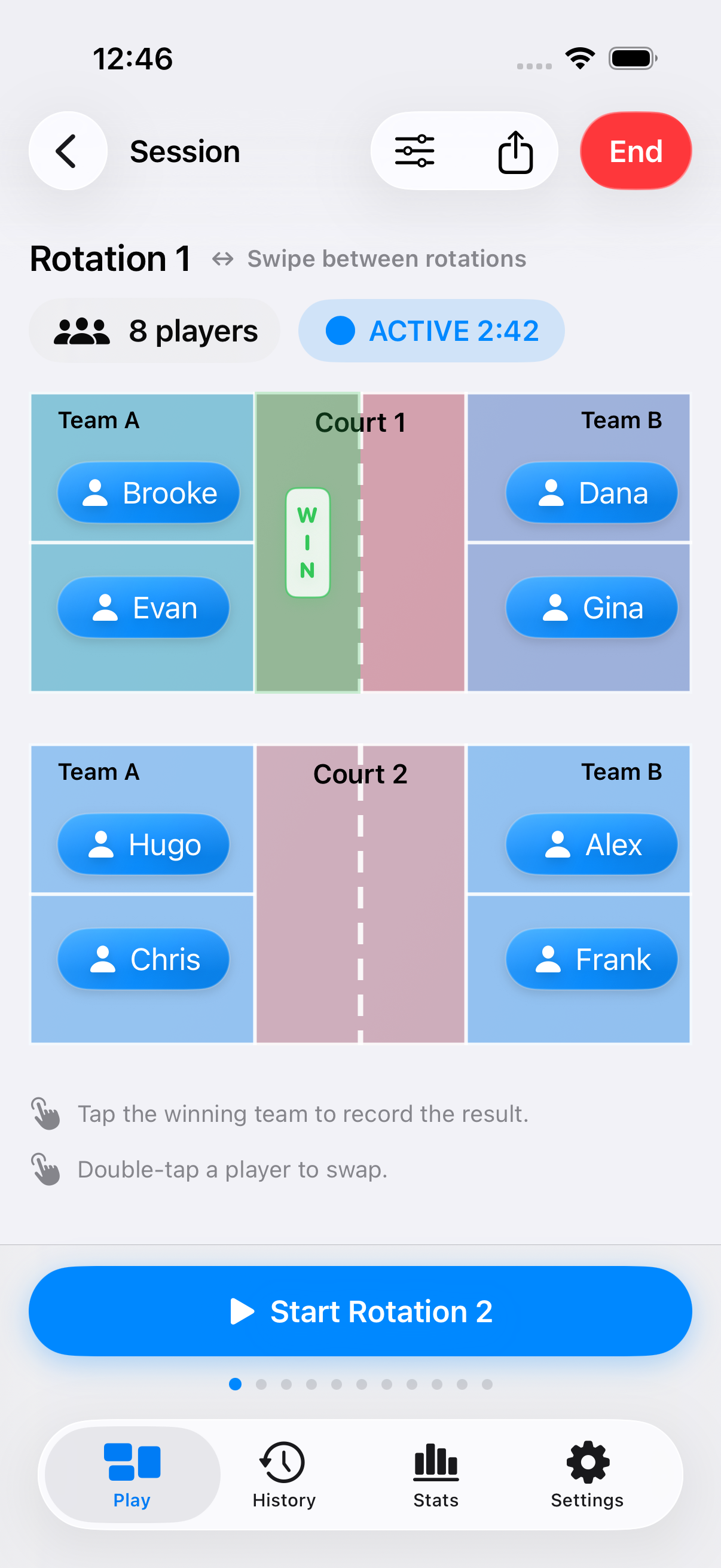 Des rotations de pickleball rapides et équitables — en quelques secondes.